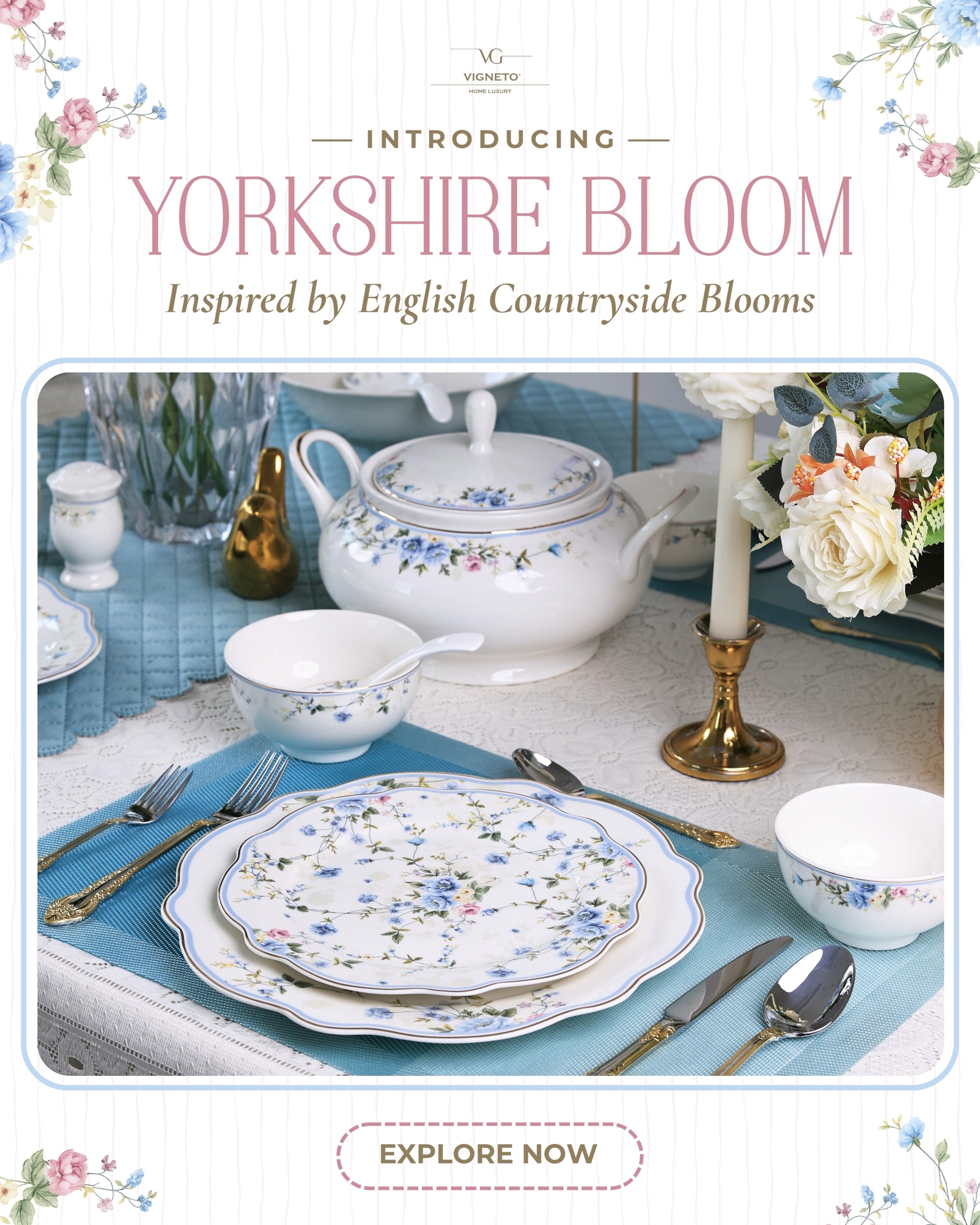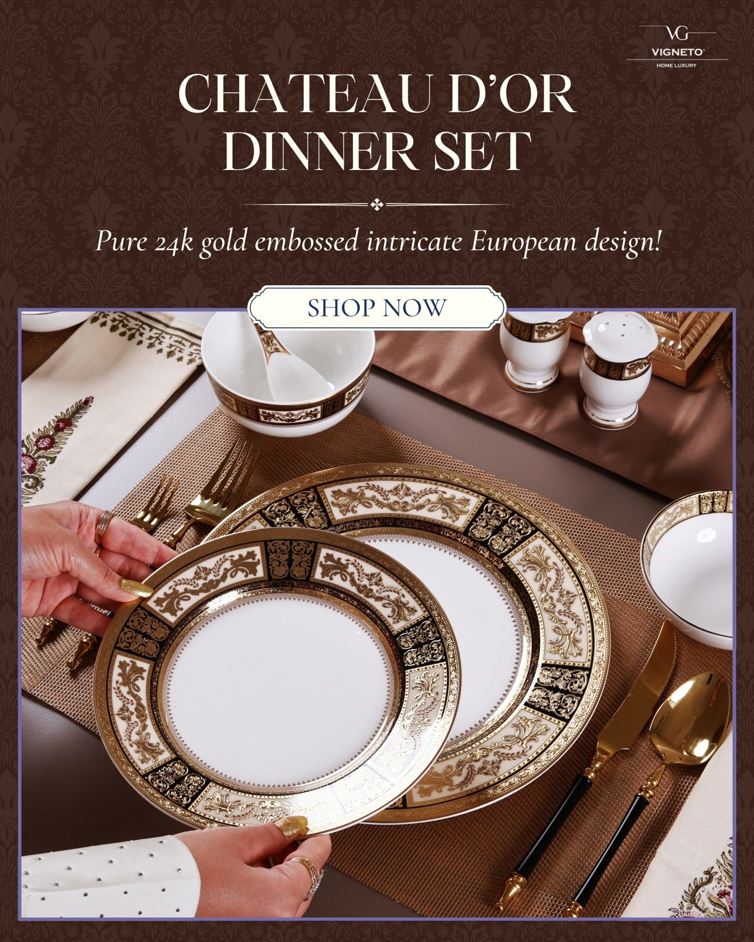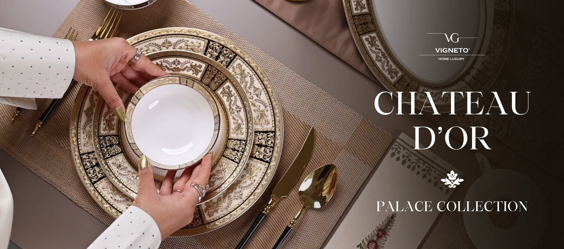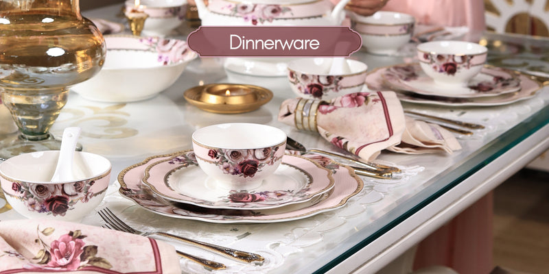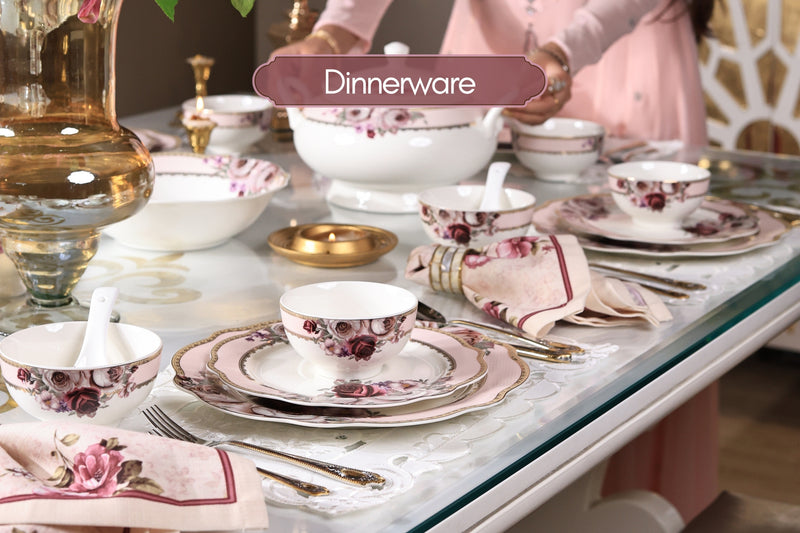 Elevate your dining experience with luxurious dinner sets, crafted from finest porcelain, accented with gold and embossed with intricate patterns!