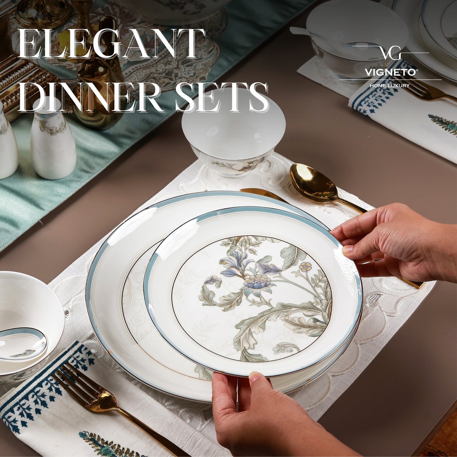 Elevate your dining experience with luxurious dinner sets, crafted from finest porcelain, accented with gold and embossed with intricate patterns!