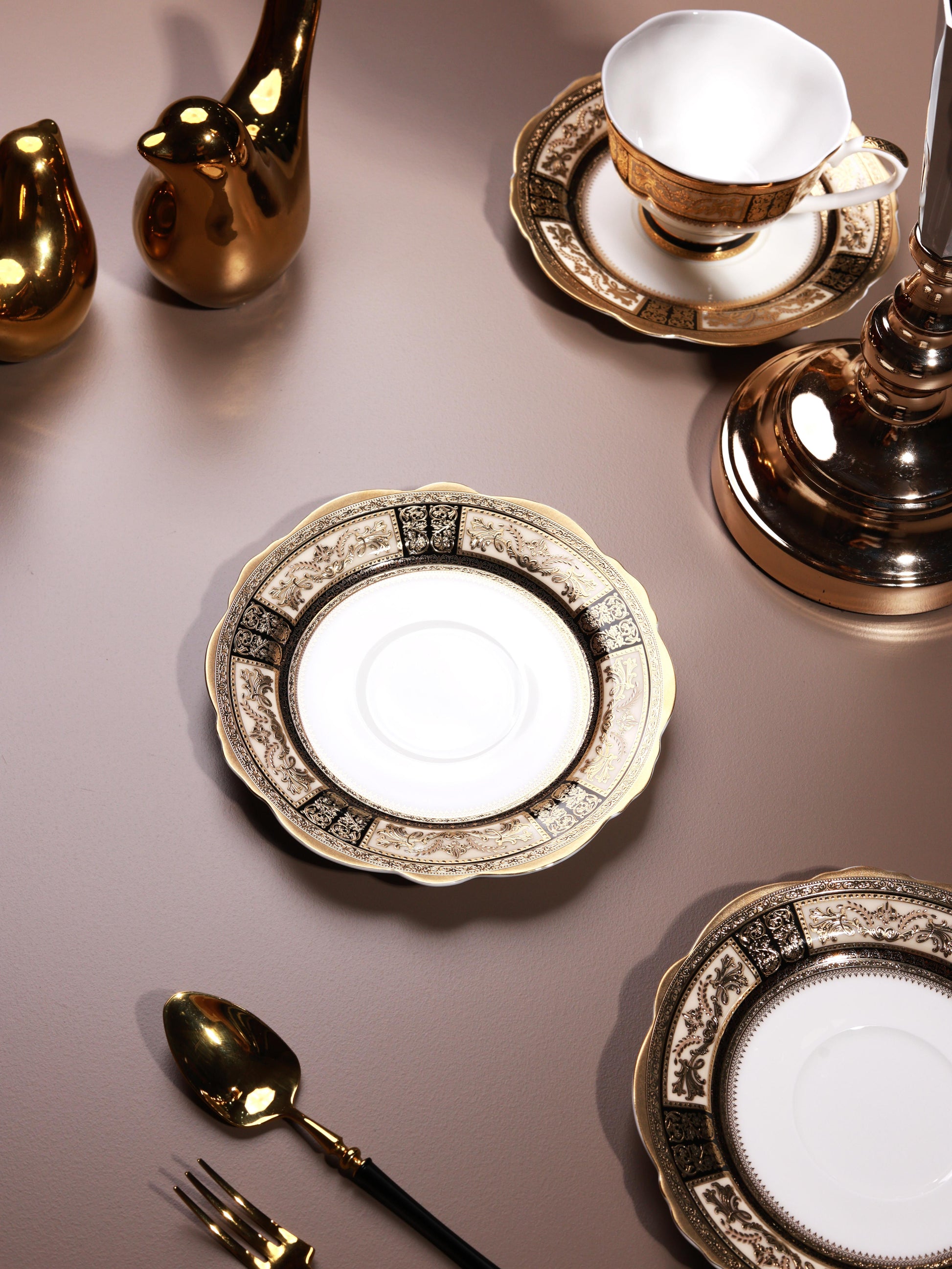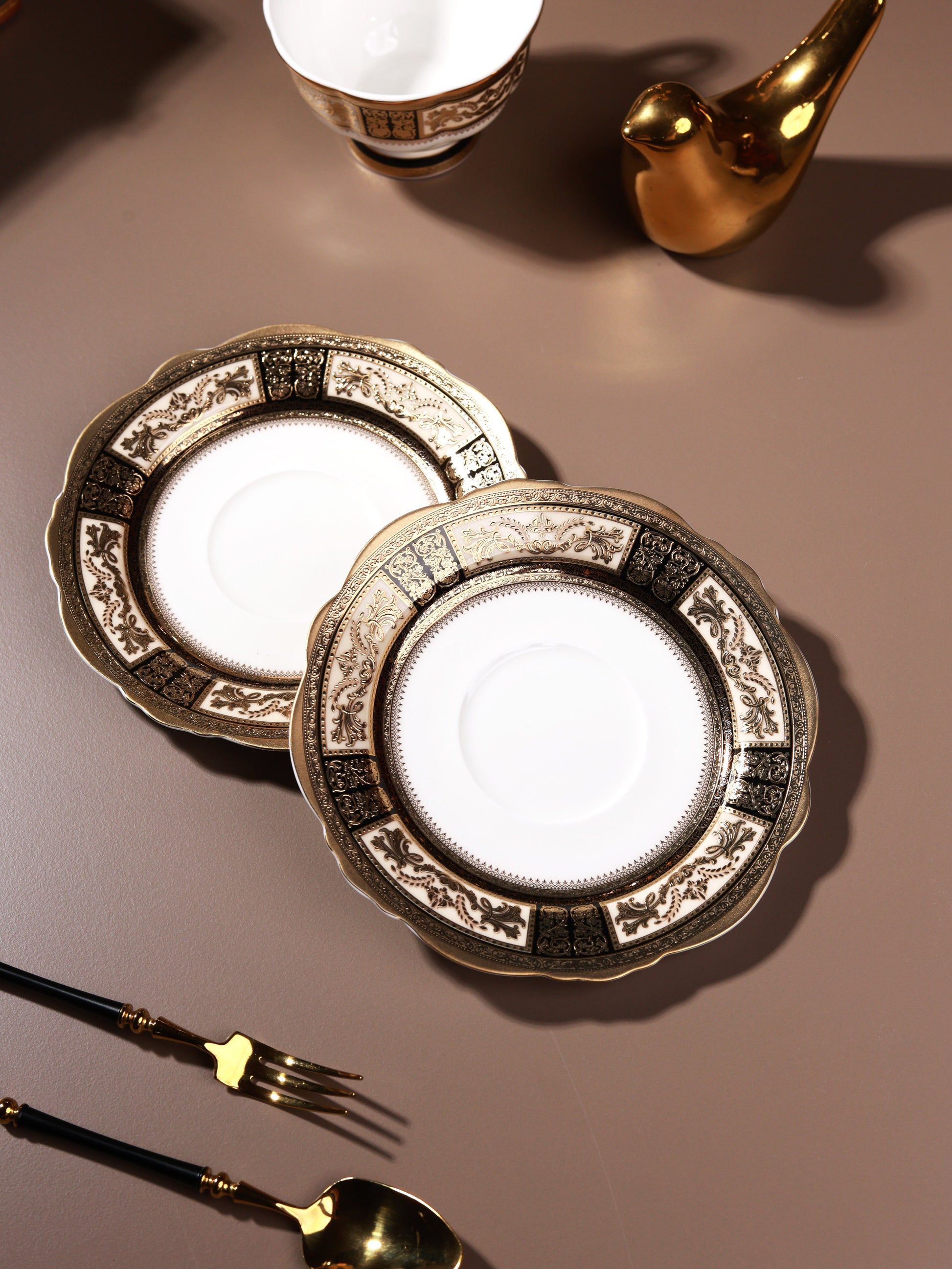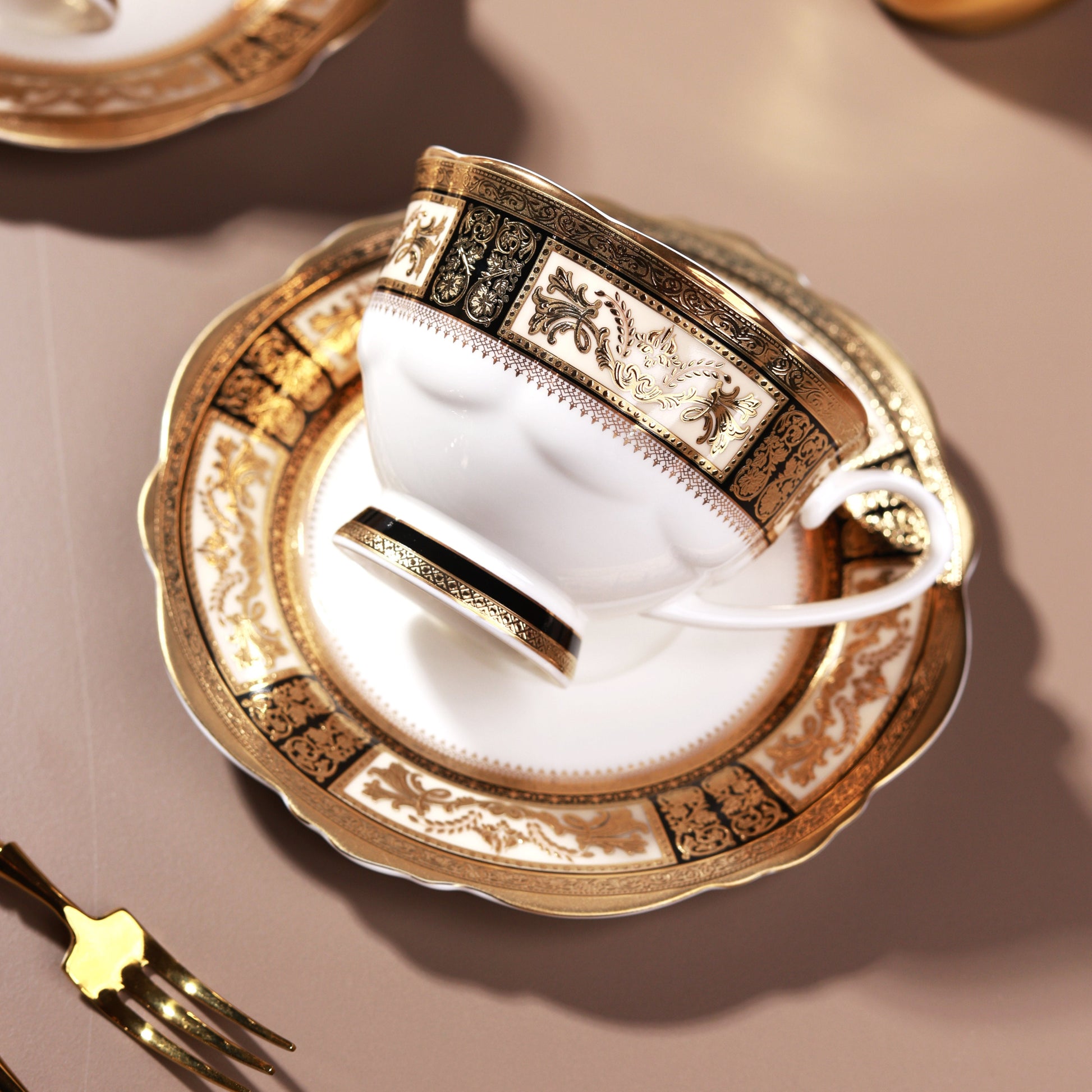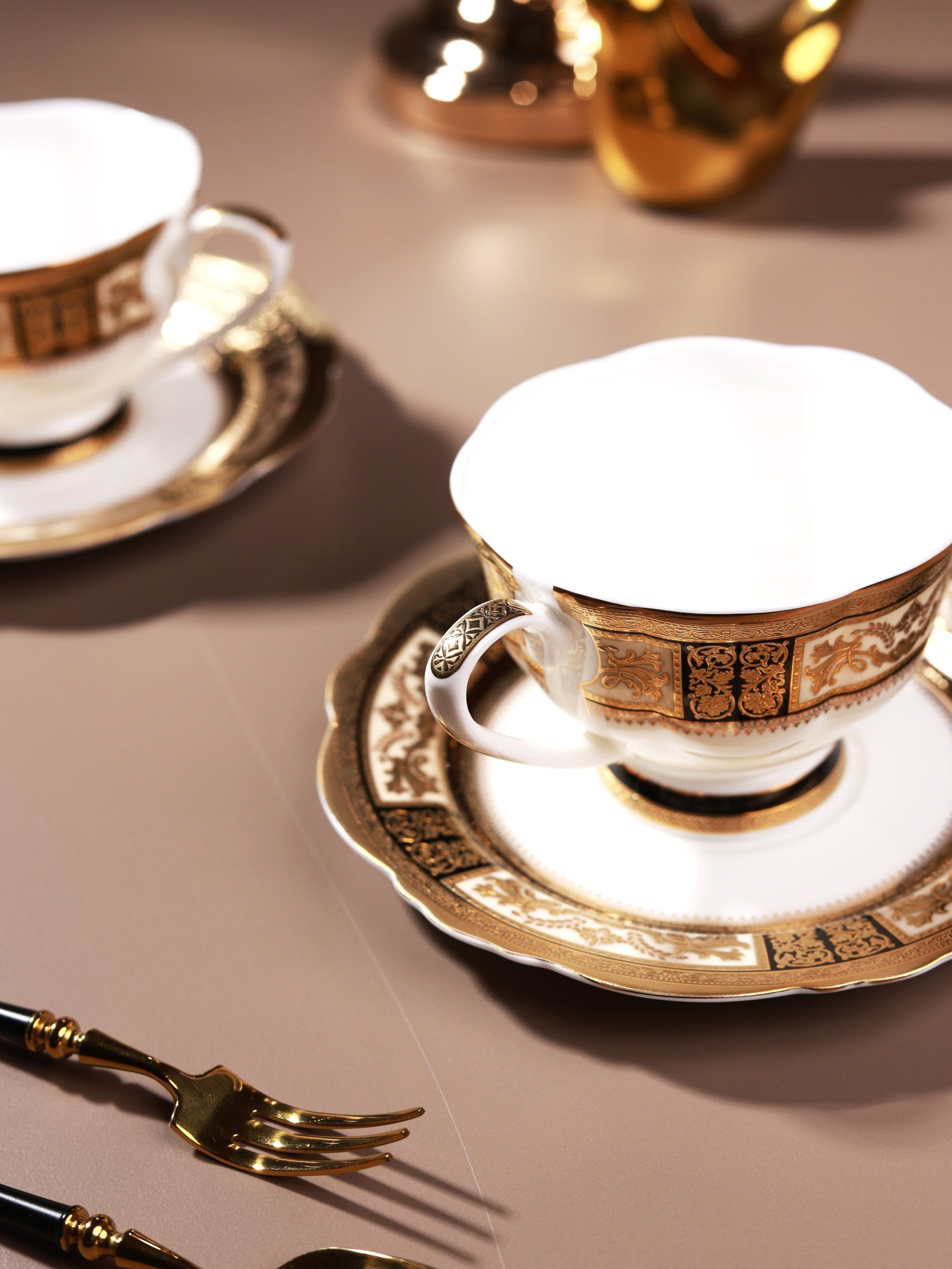Crafted in fine porcelain, Château d’Or Luxe Edition Cup and Saucer Set boasts an intricate 3D embossed detailing in pure 24K gold. Its design brings together the elegance of European baroque motifs, the grace of oriental artistry, and the timeless charm of classical patterns, creating a harmony of cultures on one plate. The luminous gold accents add depth, texture, and regal brilliance to your table. This regal teaware is ideal for lavish tea parties or as a lux gifting choice.