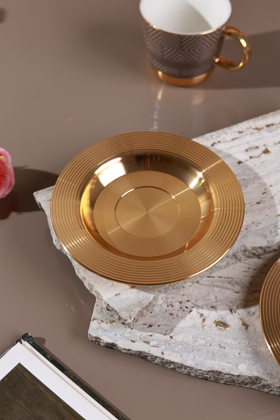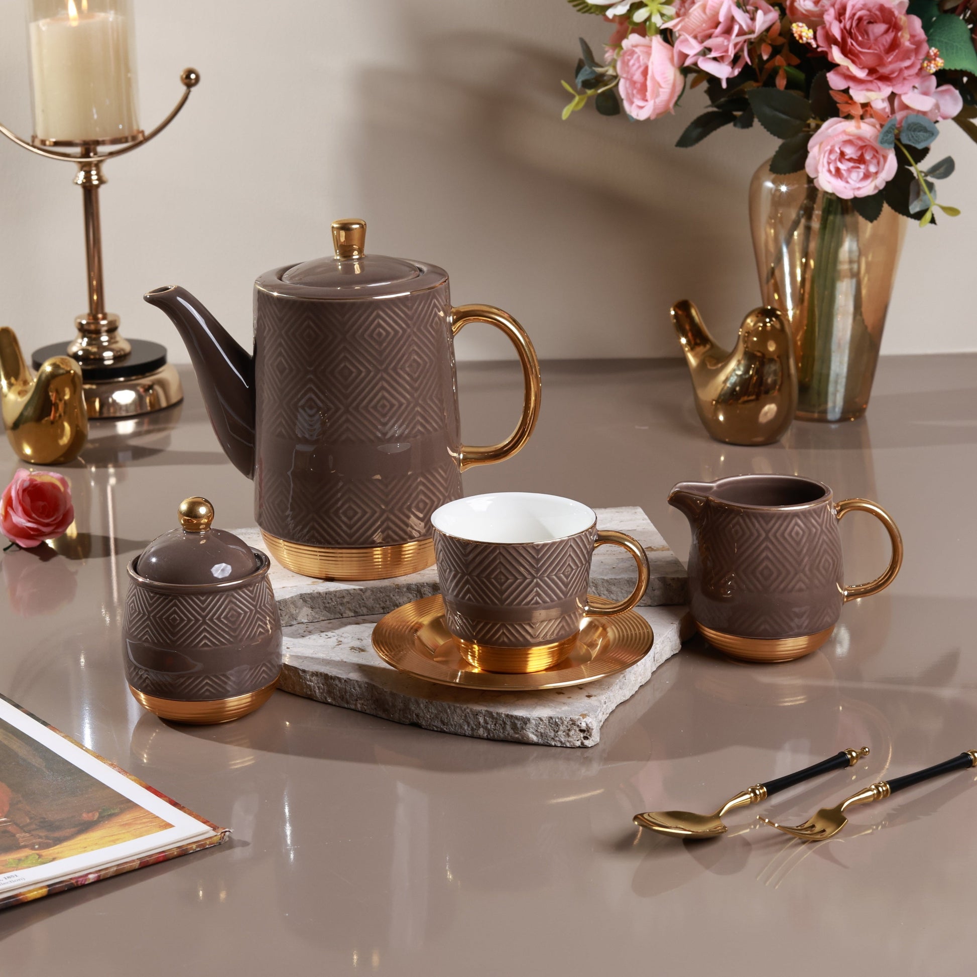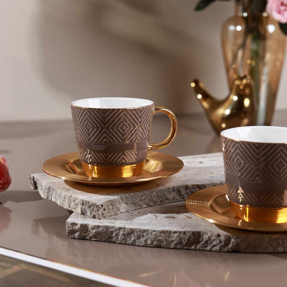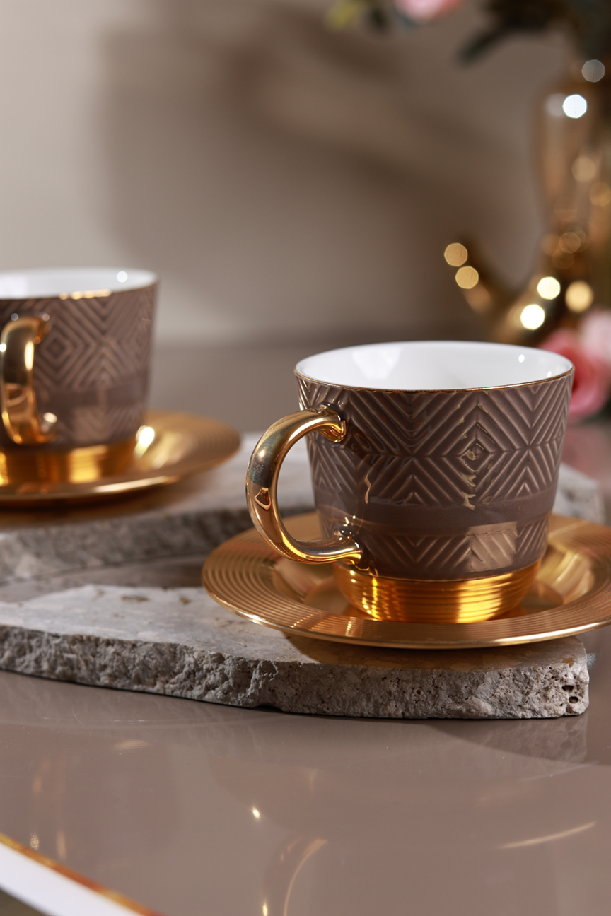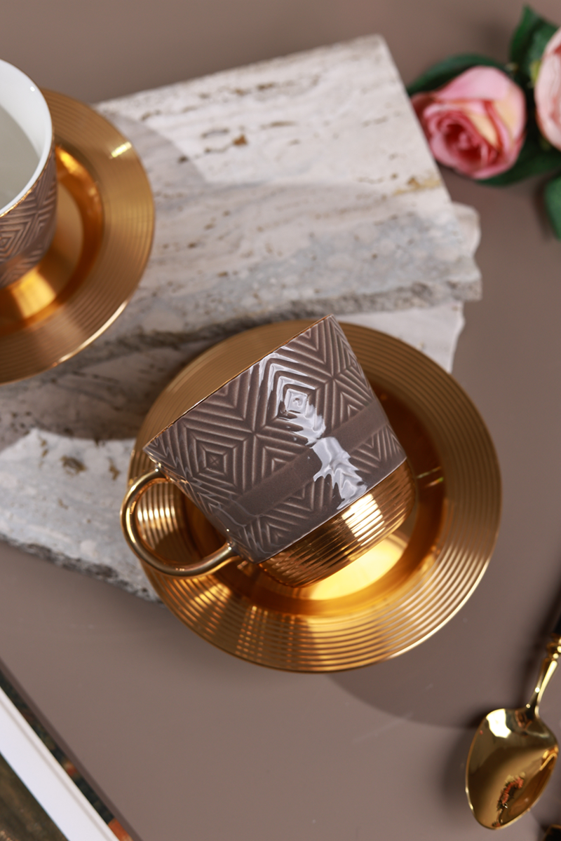 Accented with radiant gold-plated handles and a soft chestnut geometric texture, this set transforms every tea moment into a statement of style. Perfect for hosting, gifting, or simply indulging in a touch of everyday luxury.