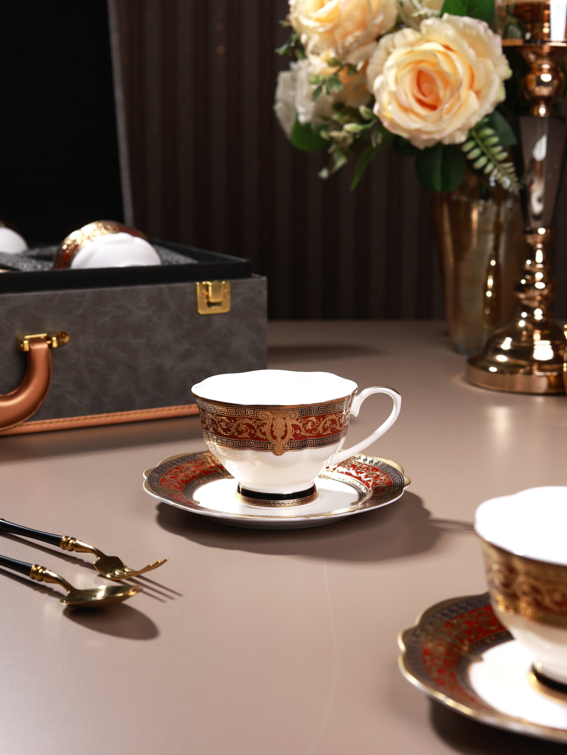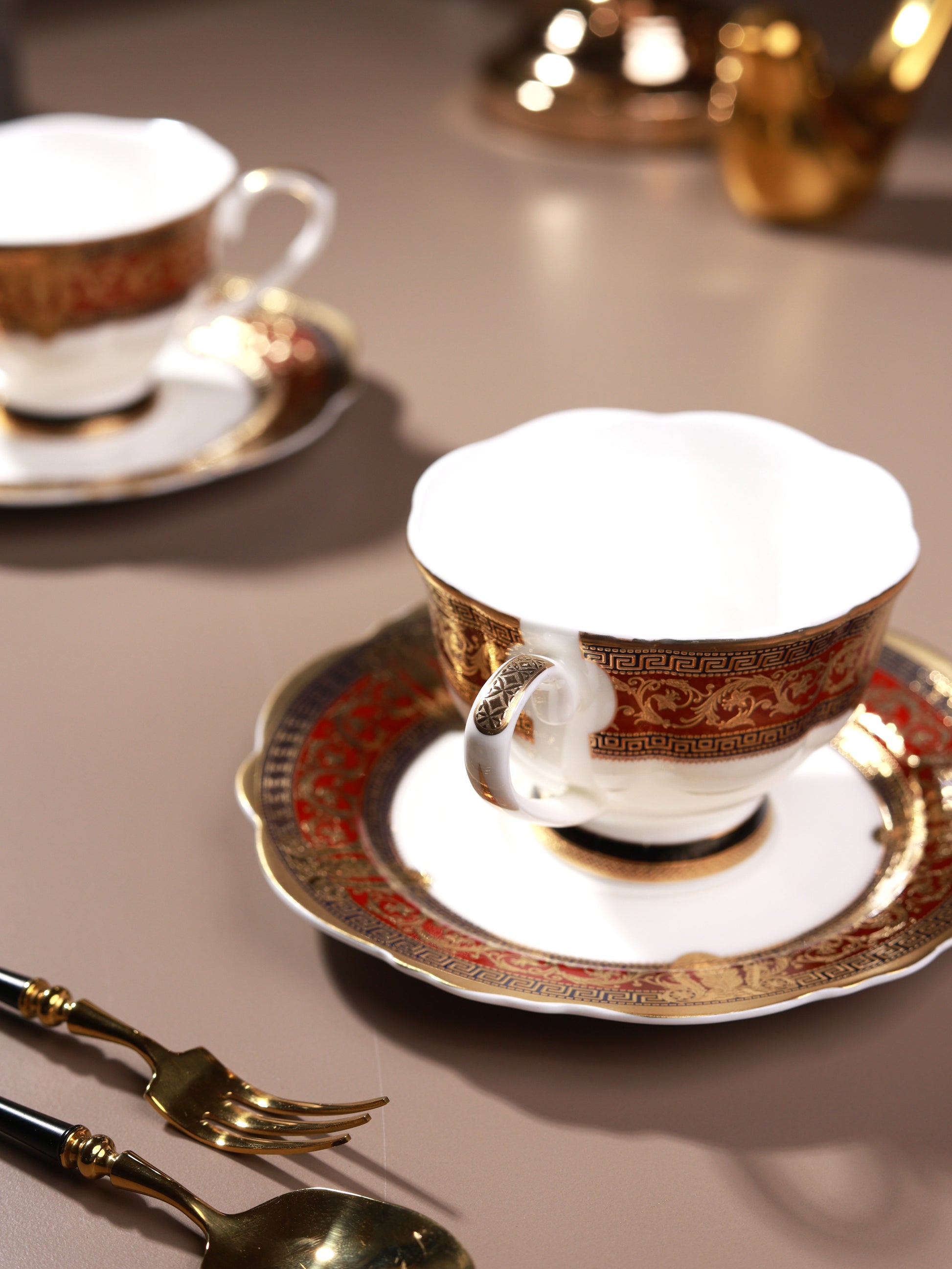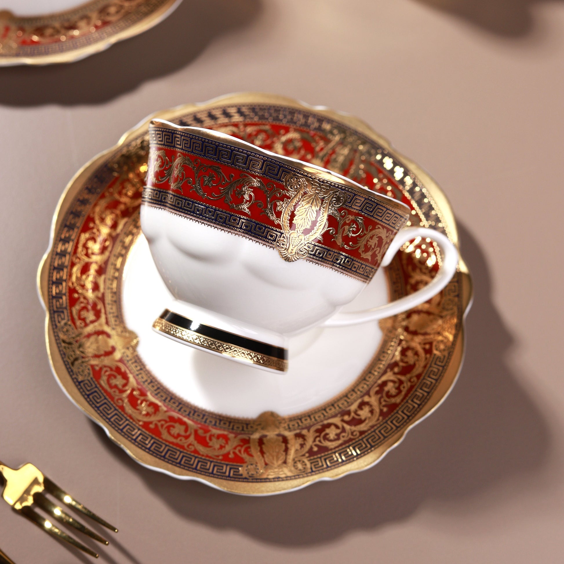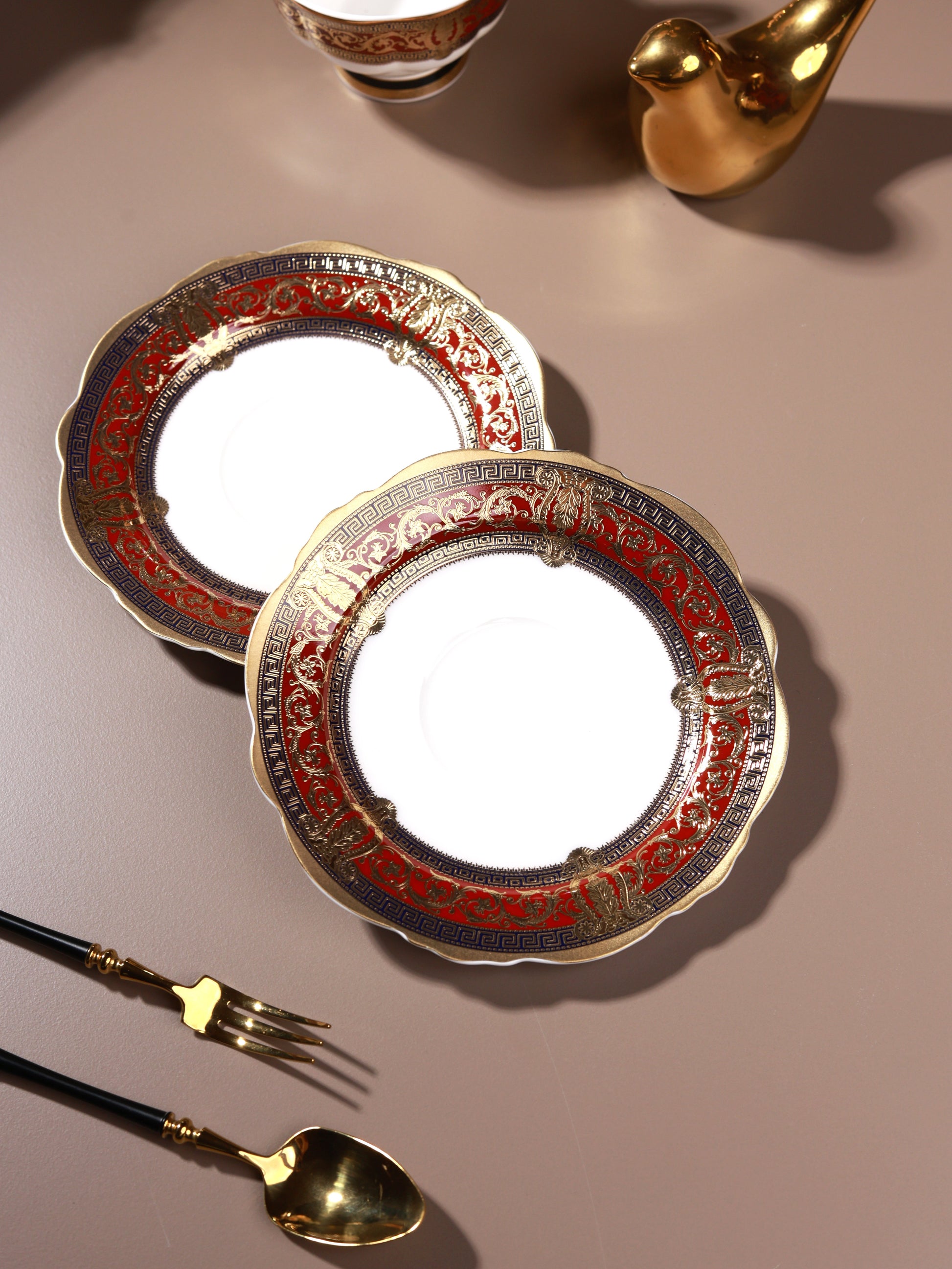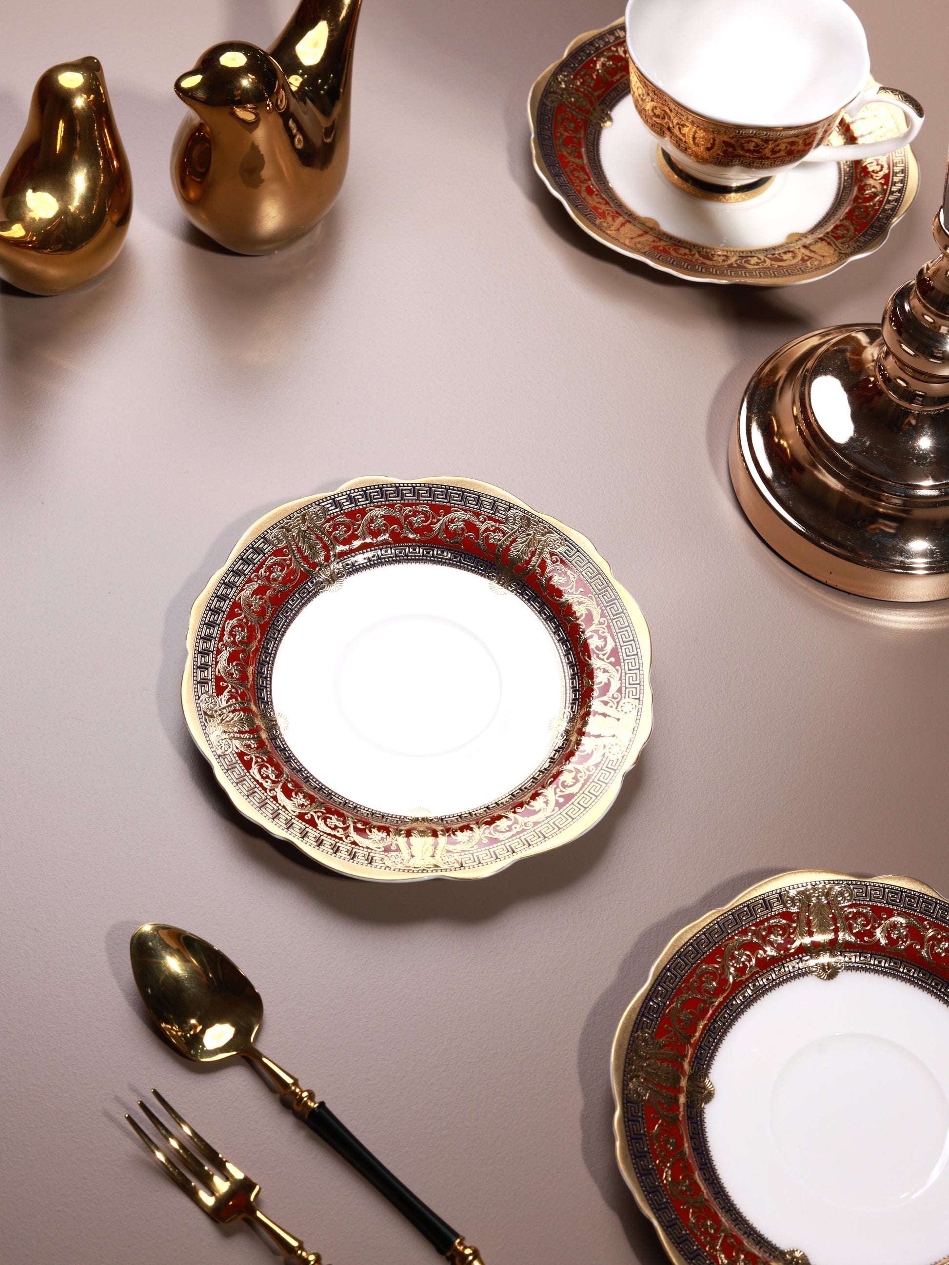 The design blends European baroque flourishes with classic Greek key patterns, creating a regal harmony of intricate swirls, bold borders, and ornamental richness. Deep crimson tones paired with radiant gold elevate every piece into a statement of luxury and refinement. With its exquisite craftsmanship and ornate 3D embossing, Crown Imperial transforms any tea time occasion into a royal feast, embodying elegance that lasts for generations.