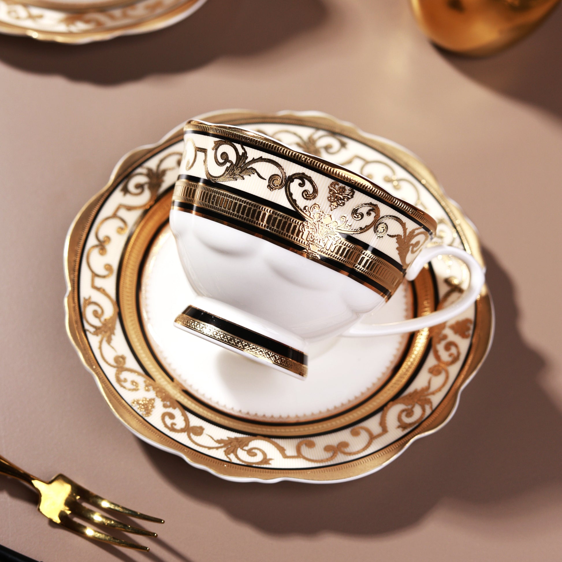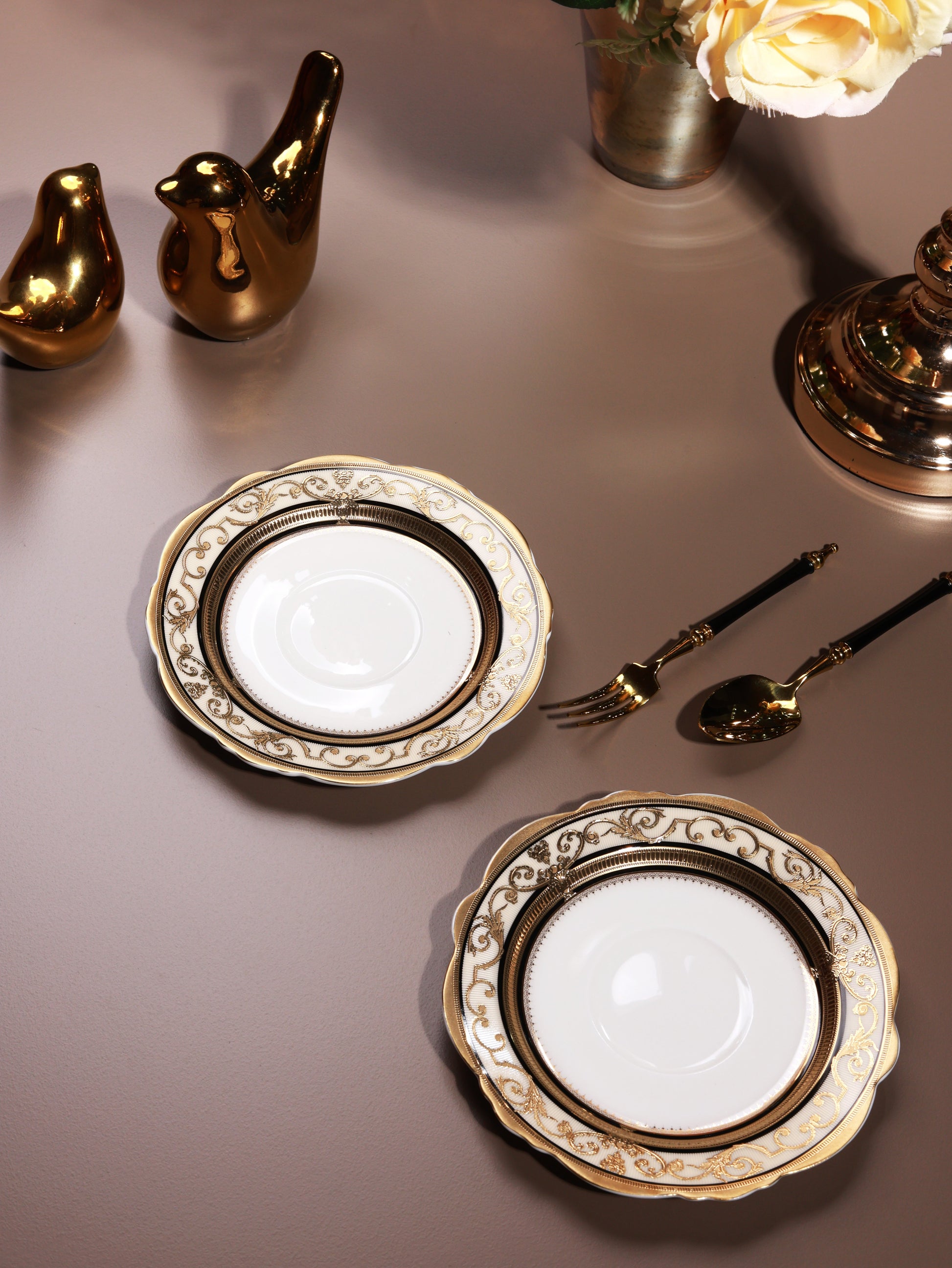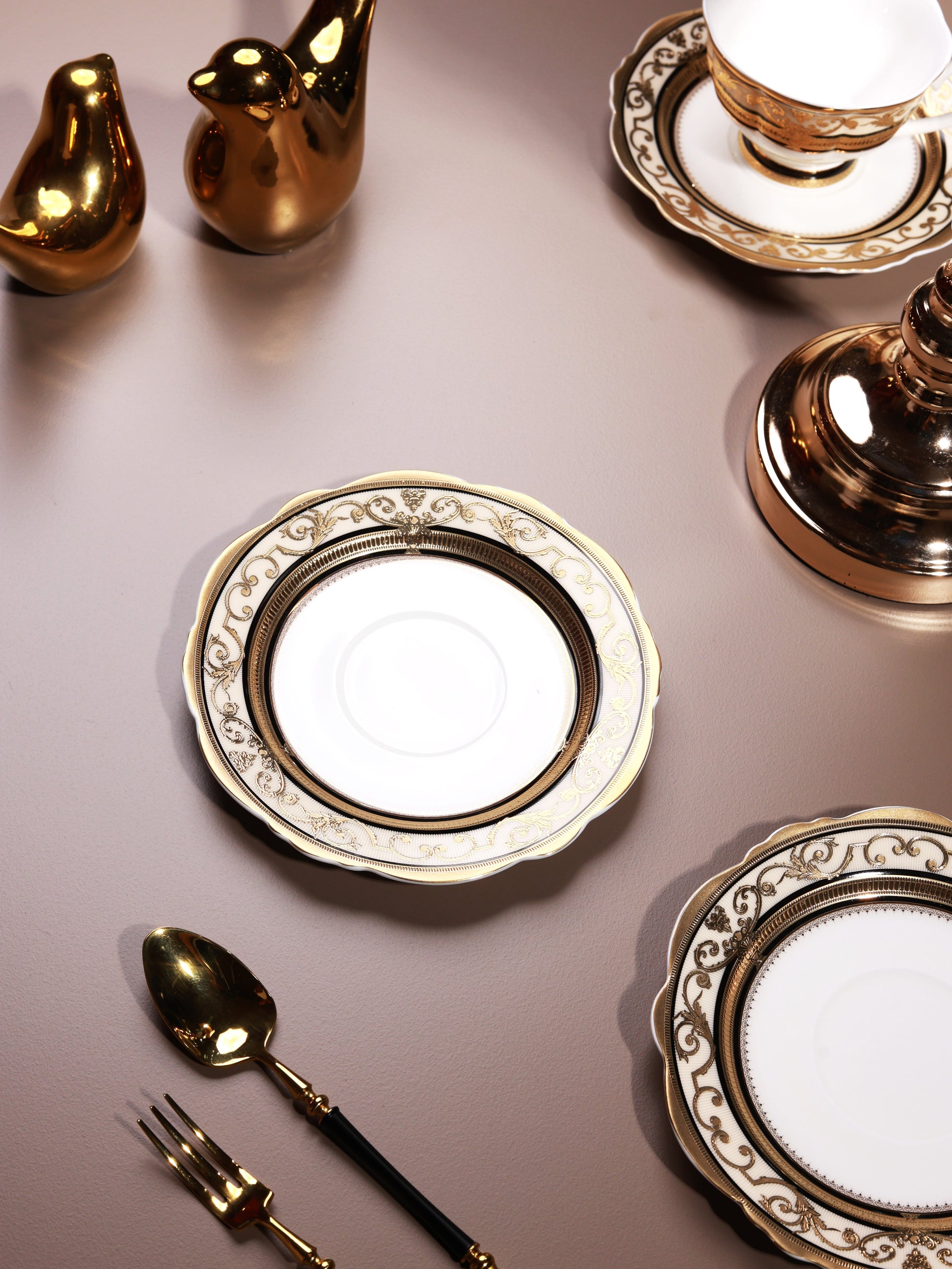 The design is inspired by European royal courts, adorned with flowing baroque scrolls, laurel wreaths, and ornamental flourishes that echo royal elegance. Crafted from the finest porcelain, each piece blends durability with sophistication, making it a masterpiece of refinement and beauty. Its radiant gold accents and intricate textures elevate every dining experience, seamlessly complementing both classic and contemporary settings.