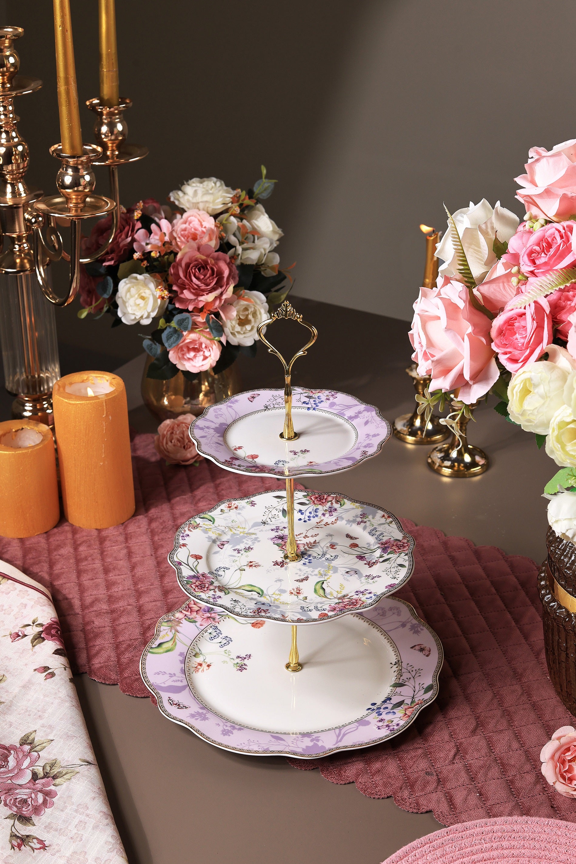 This dessert stand features delicate lilac hues and intricate floral pattern that evoke a sense of sophistication and turn dining into a luxurious experience. The gold detailing next to lavender border adds the perfect touch of elegance to this exquisite set. Display delicious brownies, pastries and muffins or mouth-watering barfi and gajjak in our unique floral shaped tableware range!