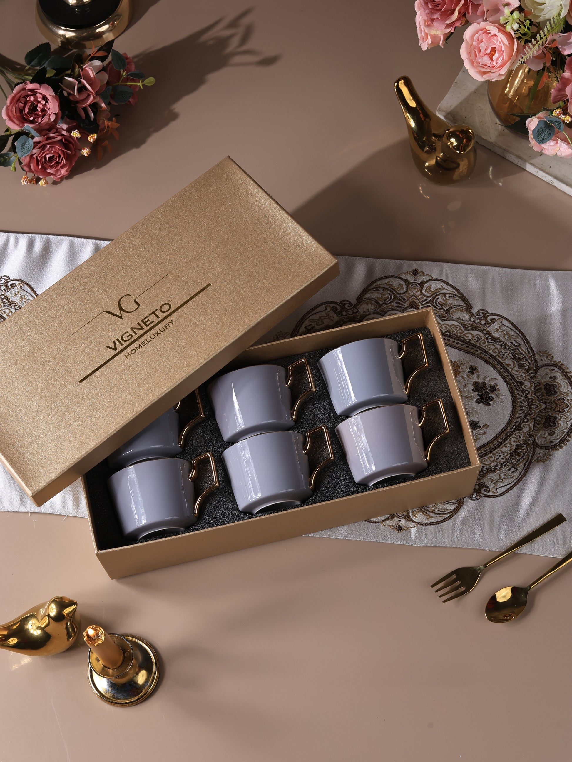Set of 6 Vigneto Coffee Mugs, with an elegant grey glaze. This Mug Set graces your table with sophistication. Experience luxury while sipping on your coffee, with our exquisite Coffee Mugs. Adorned with lavish gold accents, this set is a perfect addition to your collection or for luxurious gifting to loved ones.