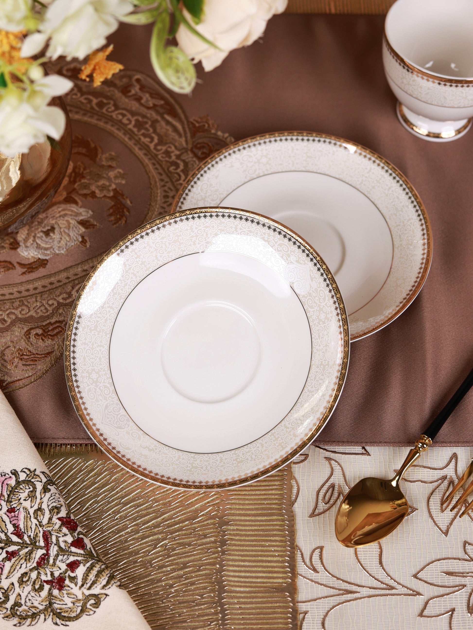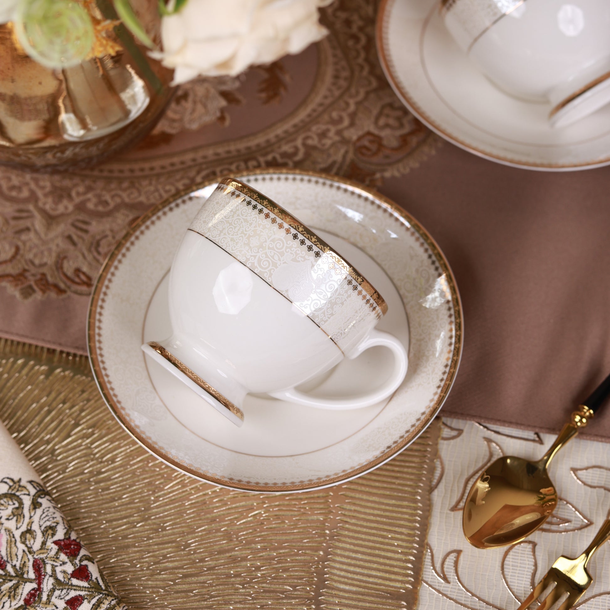 Bring a classic, elegant touch to your table with the Persian Ivory Cup and Saucer Set. Crafted from finest premium porcelain, it features delicate embossed patterns in soft ivory tones, highlighted with rich gold detailing along the rims. Perfect for both everyday use and formal tea gatherings, it brings timeless charm to every sip.
