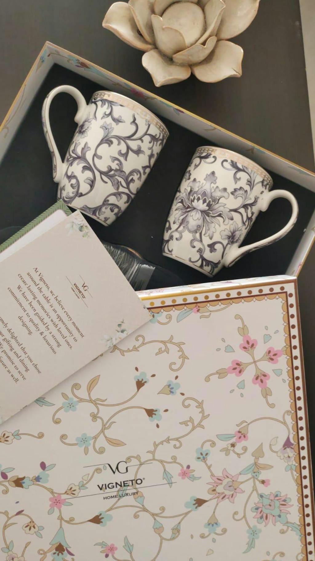Set of 2 mugs and a tray embossed with majestic arabesque pattern is a great addition to every tableware collection. The premium porcelain embellished with brilliant shades of blue makes for elegant gifting option at special events and get-together!