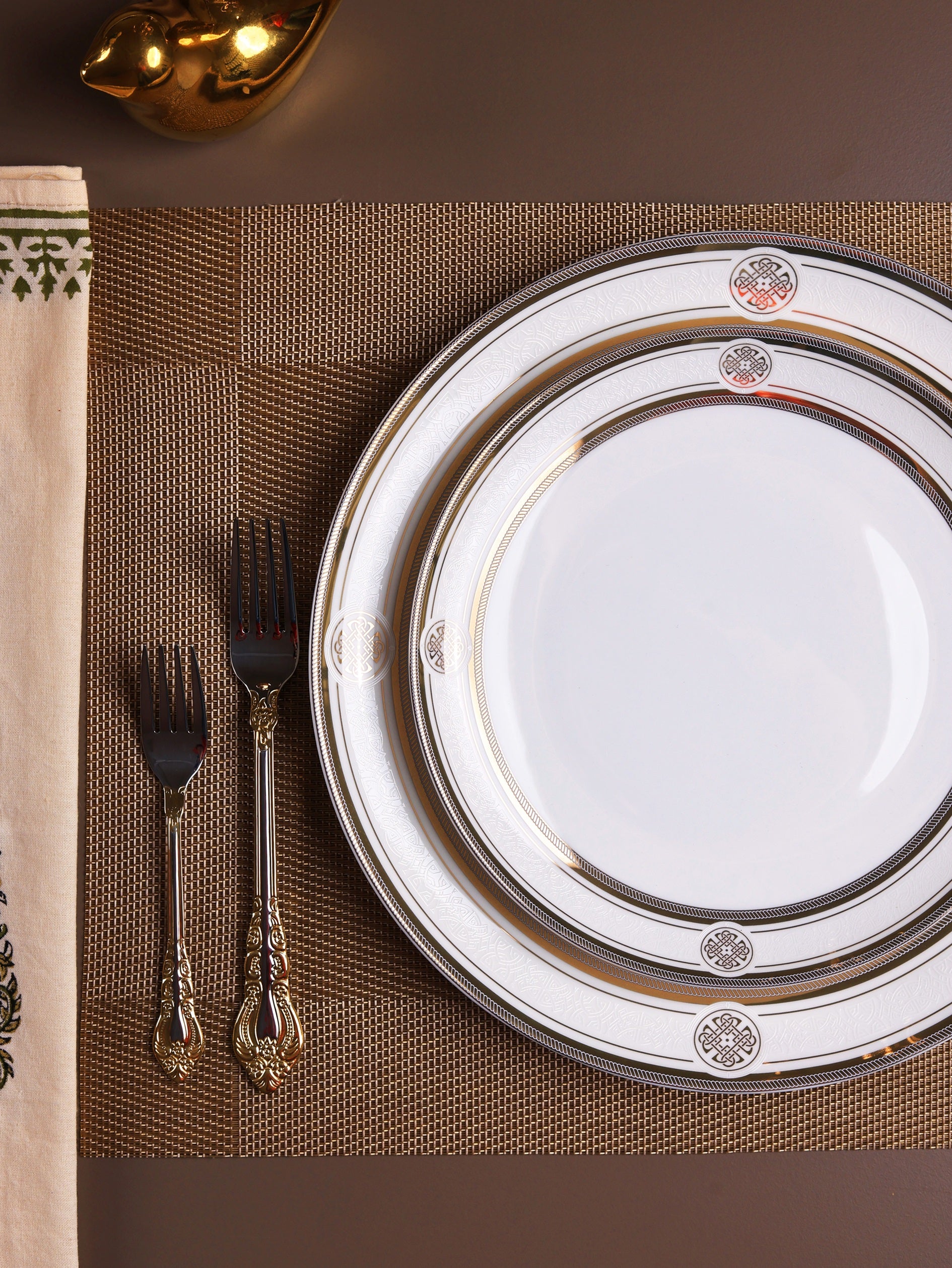 Elevate your dining experience with this exquisite Royal Emblem Fine Porcelain Dinnerware, designed for elegance, durability, and timeless sophistication. Featuring a classic ivory base with delicate gold-plated trim and intricate embossed pattern, this set adds a regal charm to every meal – perfect for formal dinners, weddings, anniversaries, and special occasions.