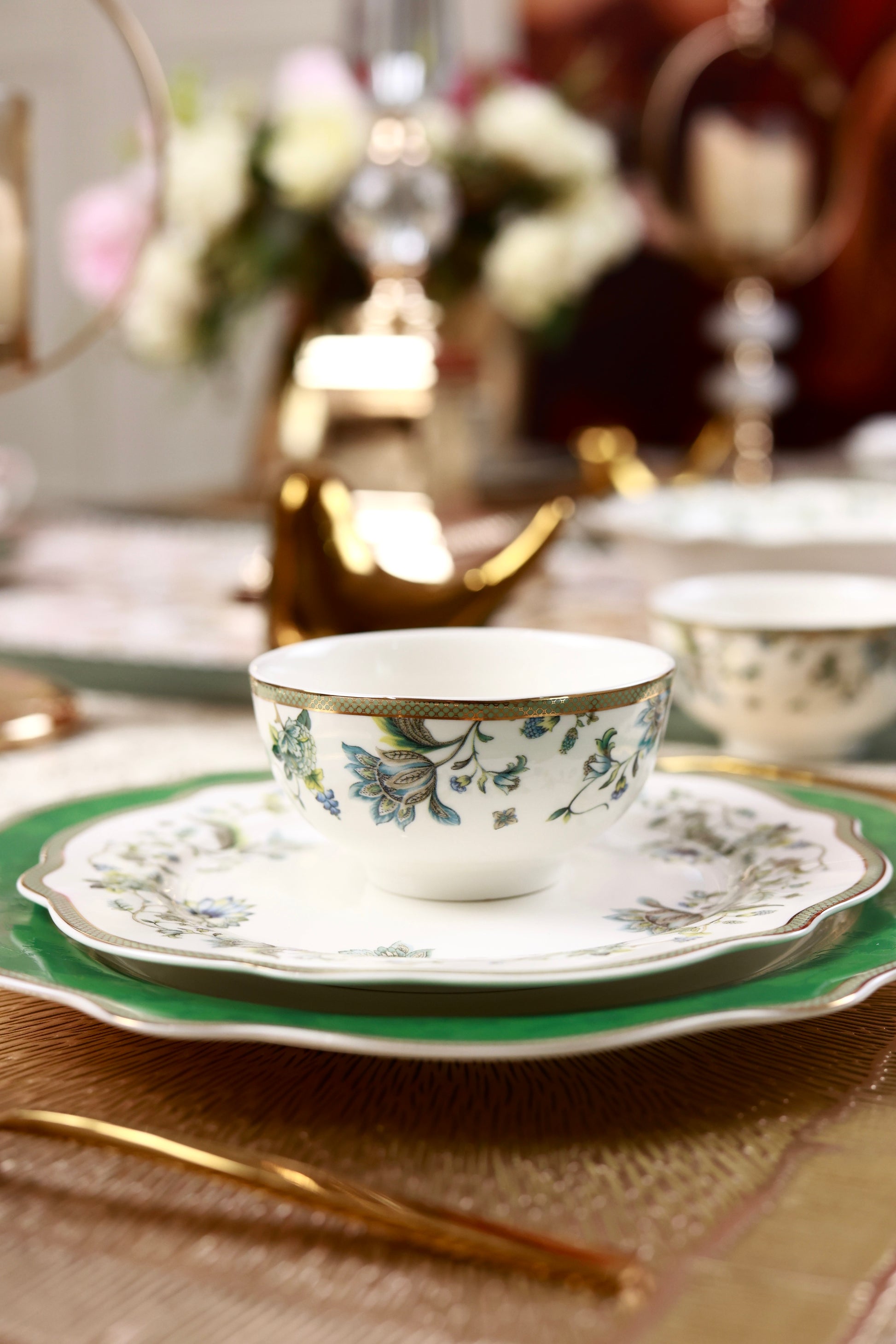 Elevate your dining experience with our newest Tudor Green Dinner Set, featuring a stunning blend of elegance and functionality. Crafted from finest premium porcelain, this set showcases rich green hues, complemented by intricate gold detailing and subtle floral design that adds a touch of sophistication to any table setting. The shimmering serpentine border makes it unique and ideal for both special occasions and everyday meals.