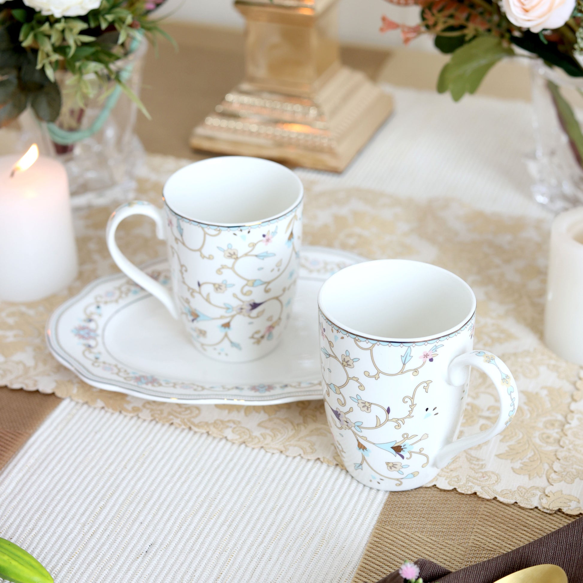 Set of 2 mugs and a tray embossed with pastel design and gold accents on high quality porcelain for displaying confectionery delights. Stylish yet functional, this exquisite pair of mugs and tray will be a perfect gifting option for your loved ones.