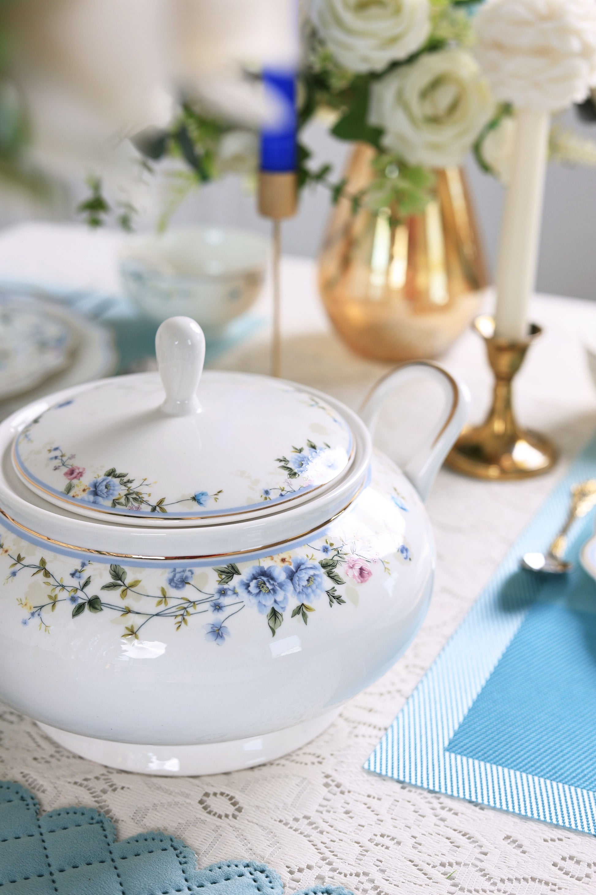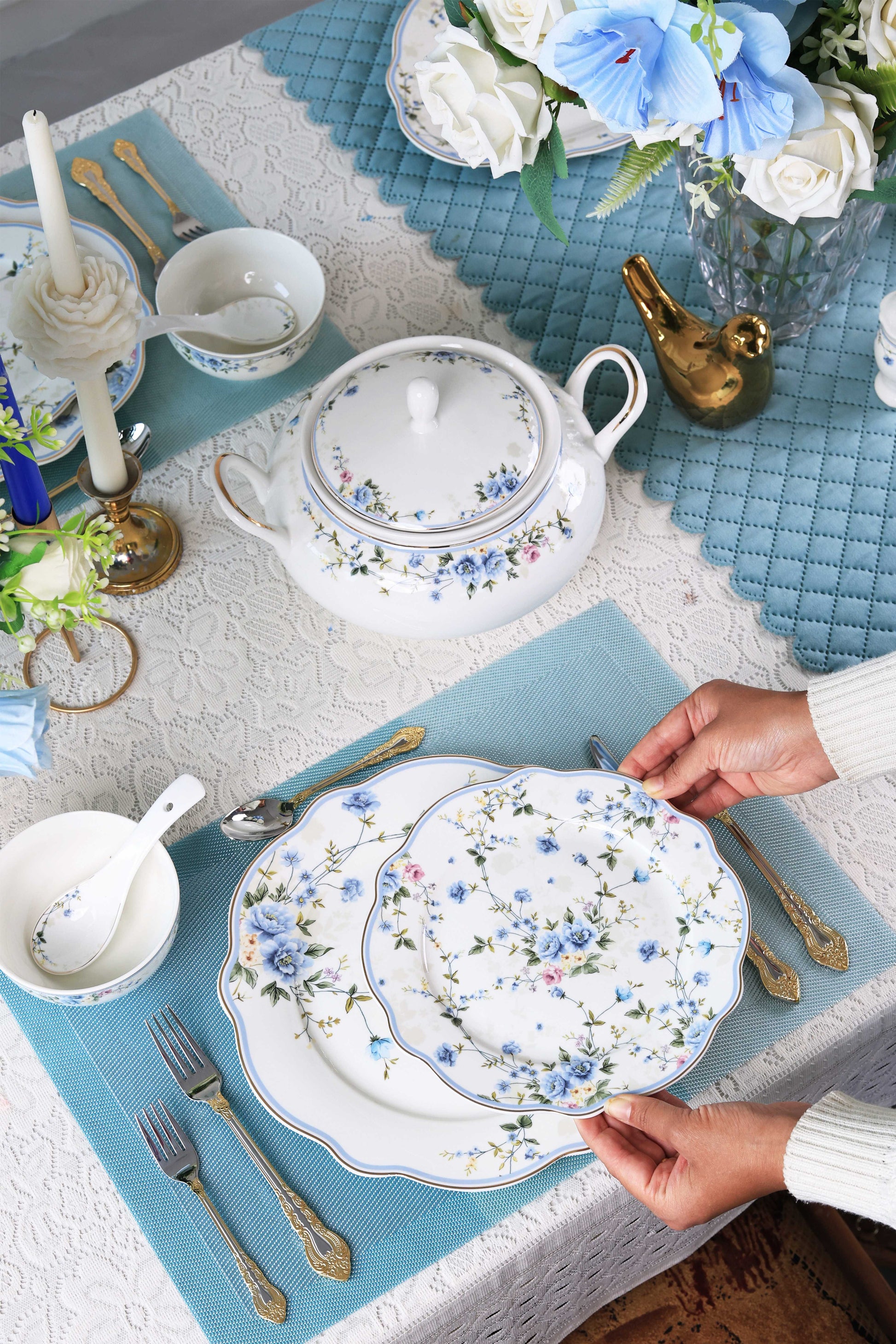 Inspired by the picturesque landscape of Yorkshire, England, the tableware is embossed with delicate flowers in baby blue and pink. This luxury dinner set showcases graceful florals flowing across fine premium porcelain, enhanced by a scalloped silhouette and an elegant gold and blue border. Designed for refined hosting and formal dining, it transforms every meal into a sophisticated, nature-inspired tablescape.